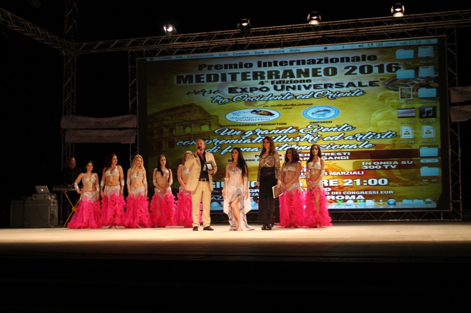 Si e’ svolto con grandissimo successo, inaugurando il bellissimo spazio estivo del Palazzo dei Congressi, Teatro Le Terrazze Eur,di Roma, la quarta edizione del Premio Internazionale Mediterraneo- verso Expo Universale (tra Occidente ad Oriente), prodotto dalla Mediterraneos Production di Gianni Gandi (compositore e produttore discografico) e Pietro Fotia, in collaborazione con l’O.m.p.s.e.c.o di Liberato Mirenna (fondatore Tempio Shaolin in Italia e dirett. Universita’ Arti Marziali), dopo i vari successi di Expo d’Oriente e Viaggio d’Oriente del 2015 e, nella stessa giornata di questo Premio, anche il Festival delle Arti Marziali (sempre dirett. Mirenna) e il Festival delle Danze Orientali , dirett. Maryem Bent Anis, ballerina e coreografa. Il Premio e i 2 festival sono le prime tappe verso un grandissimo evento del 2017: Expo Universale.