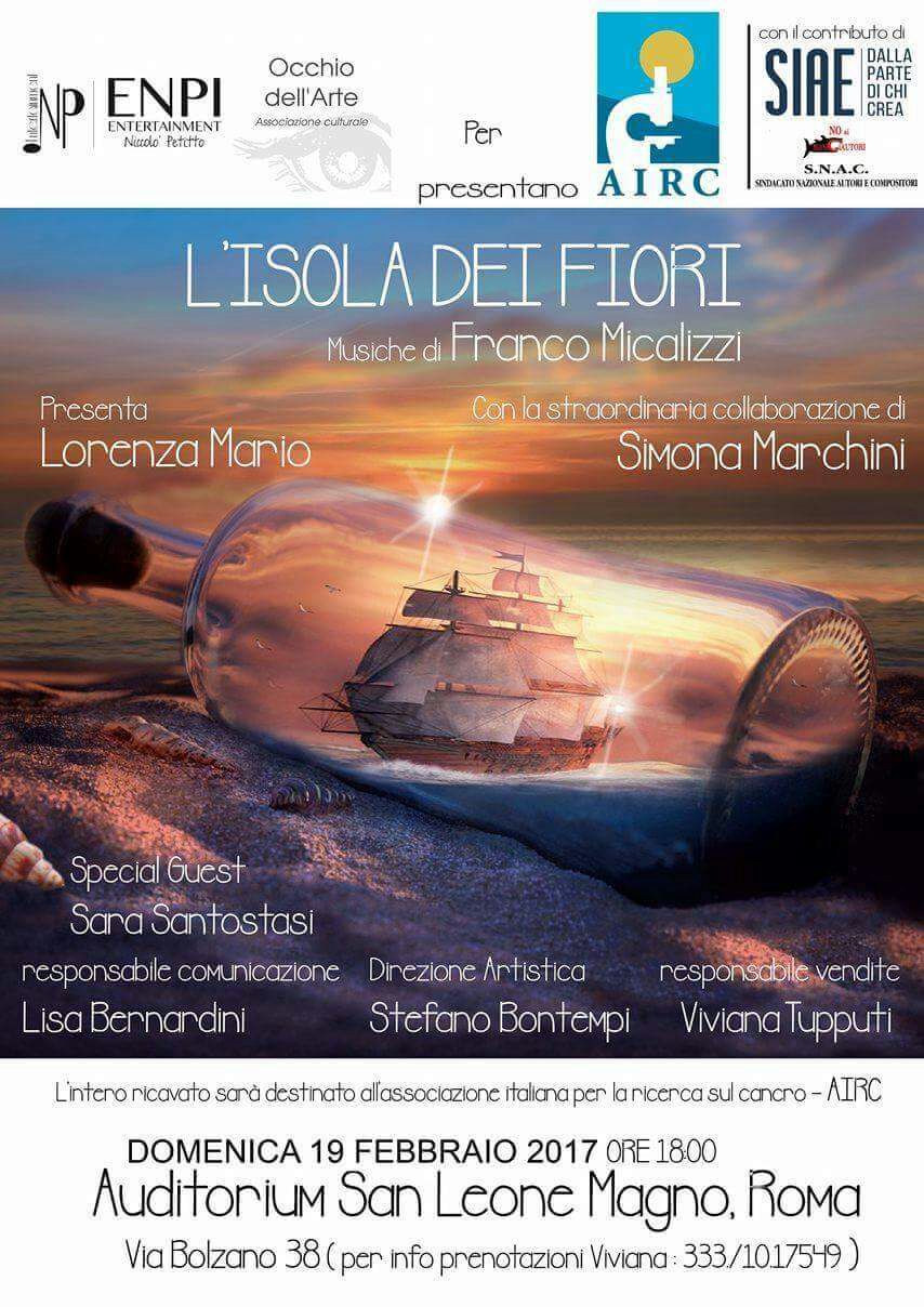 Con il contributo economico di SIAE (Società Italiana degli Autori ed Editori) e S.N.A.C. (Sindacato Nazionale Autori e Compositori), sara’ di prossimo varo un evento all’Auditorium San Leone Magno di Roma a favore dell’Associazione Italiana per la Ricerca sul Cancro, organizzato dalla Enpi Entertainment di Niccolo’ Petitto in collaborazione con l’Associazione culturale Occhio dell’Arte. Il prossimo 19 Febbraio, nell’Urbe, ben 7 scuole di danza, provenienti non solo da Roma ma anche da altri luoghi del Lazio – una scuola che ha aderito al progetto è addirittura campana – balleranno sulle musiche dell’ultimo CD del Maestro Franco Micalizzi, “L’Isola dei Fiori”, in uno spettacolo che coniugherà Danza e Arti visive per raccogliere fondi a sostegno della ricerca sui tumori pediatrici. Centinaia di posti a sedere a disposizione di chi vorrà sostenere la ricerca scientifica per dare un messaggio concreto alle giovani generazioni che il cancro è sempre più curabile.”Sono orgoglioso di poter mettere a disposizione la mia musica per uno scopo cosi’ nobile” – dichiara entusiasta il grande compositore e direttore d’Orchestra.”Il mio ultimo lavoro, “L’Isola dei Fiori”, si ispira al primo fiore sbocciato all’interno della capsula spaziale internazionale in orbita intorno alla terra nel Gennaio di quest’anno. Ho sentito l’emozione di questo piccolo grande avvenimento, e ho voluto dedicare ai fiori di ogni specie e latitudine 12 brani musicali che ne descrivono la bellezza e lo splendore dei colori con atmosfere particolarmente suggestive. Che ragazzi giovani se ne siano innamorati ed abbiano deciso di far sposare la mia musica a questo progetto solidale, che contribuisco a promuovere in prima persona, non puo’ che rendermi doppiamente felice ed orgoglioso”.Lo spettacolo avrà la straordinaria collaborazione artistica di Simona Marchini, premiata in serata alla carriera; atteso per un riconoscimento anche il grande attore Giancarlo Giannini.Volti noti saranno fra il pubblico, per dare un messaggio di fiducia nella ricerca con la loro presenza e continuare il sogno di Umberto Veronesi di sconfiggere il male del secolo.La conduzione sarà affidata alla bravura e al talento della ballerina Lorenza Mario.Le scuole partecipanti al progetto: SCUOLA DI DANZA TERSICORE (Ostia) – SCUOLA SANTINELLI (Sede – IALS) di Roma; BALLET CENTER di Maria Luisa Rubulotta (Civitaveccchia); IL PROSCENIO di Paloma Farinosi (Bracciano); ARTE E BALLETTO (Frosinone); SPAZIO DANZA (Casal di Principe); BALLETTO DI ROMA di Flaminia Buccellato (Roma).Tra gli ospiti della serata, il volto noto di Sara Santostasi, attrice e cantante, che da “Ballando con le Stelle” al musical “Dirty Dancing ha dimostrato in realtà di essere anche una stella delle punte.Direzione artistica di Stefano Bontempi, testi di Raffaello Fusaro.