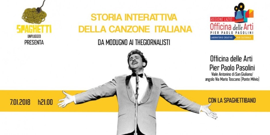 Officina Pasolini è felice di poter inaugurare il primo mese di programmazione del 2018 ospitando sul proprio palco un’edizione molto speciale di Spaghetti Unplugged. Un viaggio attraverso le più importanti canzoni della musica leggera italiana per raccontare i grandi capolavori del nostro cantautorato, da Domenico Modugno a Francesco De Gregori, da Luigi Tenco a Daniele Silvestri, fino alla nuova generazione contemporanea. Venti canzoni spiegate ed eseguite dal vivo dalla #SpaghettiBand e da alcune voci della nuova scena romana. Spazio all’Open Mic per per chi vorrà cantare con noi e, per chi lo desidera, dalle ore 20.00 aperitivo.