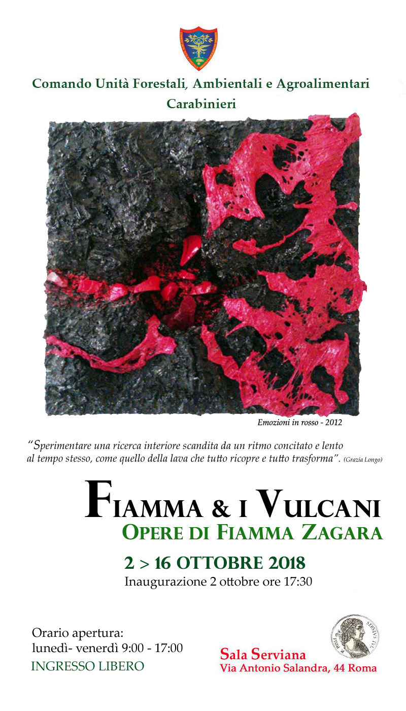 Il titolo della mostra è: “Fiamma e i Vulcani”, che gioca su diversi accostamenti e rimandi: il simbolo dell’Arma, il nome dell’artista e il suo mondo espressivo fortemente ispirato ai vulcani.