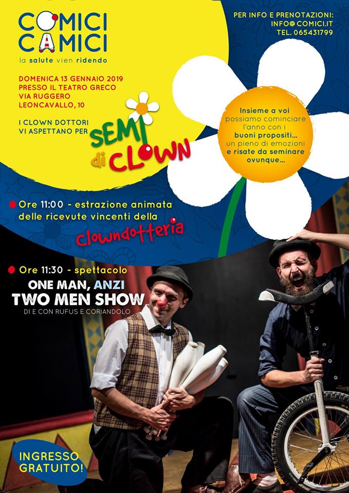 ROMA – Un spettacolo esplosivo, dove gag di tradizione circense, illusionismi e comicità si fondono in maniera irresistibile, dando vita ad un divertente spettacolo dove il pubblico è sempre protagonista. La onlus dei clown dottori Comici Camici vi invitano Domenica 13 gennaio (ore 10,30) al Teatro Greco di Roma per lo gratuito (ma con prenotazione obbligatoria) “One Man, Anzi Two Men Show” di e con Rufus e Coriandolo.