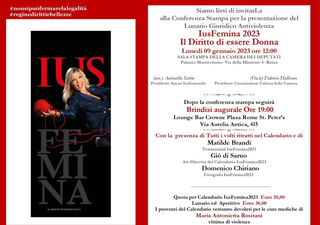 L’attesissimo lunario giuridico antiviolenza, Ius Femina 2023, ideato dall’avv. Antonella Sotira presidente dell’Ass.ne Ius Gustando, verrà presentato il 09.01.2023 alla Camera dei Deputati con il sigillo del Presidente della Commissione Cultura VII “Cultura, Scienza e Istruzione” della Camera dei Deputati On. Federico Mollicone.