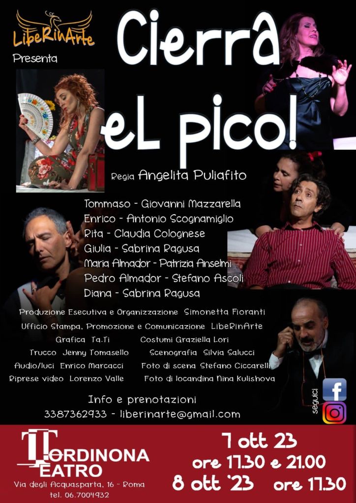 Triplo appuntamento il 7 ottobre, con un doppio spettacolo pomeridiano e serale, e l’8 ottobre 2023 con la pomeridiana. Impegnati sul palco la compagnia amatoriale “C’era un’altra volta” composta da Giovanni Mazzarella, Antonio Scognamiglio, Claudia Colognese, Sabrina Ragusa, Patrizia Anselmi e Stefano Ascoli che, con la sapiente regia di Angelita Puliafito, torneranno a far divertire il pubblico. Cierra el Pico! è presentato dall’associazione Liberinarte, realtà romana molto attiva nell’ambito teatrale e del musical, sia per la formazione di nuovi talenti adulti e piccini, che per la messa in scena di spettacoli, scelti o creati ad hoc, con attori professionisti ed amatoriali.